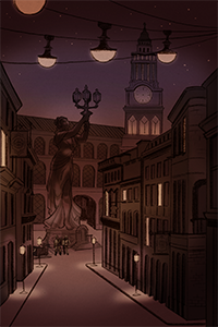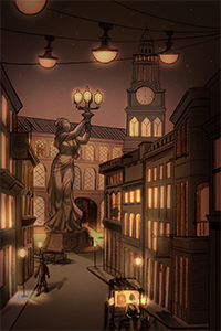 Environment illustrations for a indexbrew D&D setting: a Gilded Age-inspired city set in a world of eternal night.